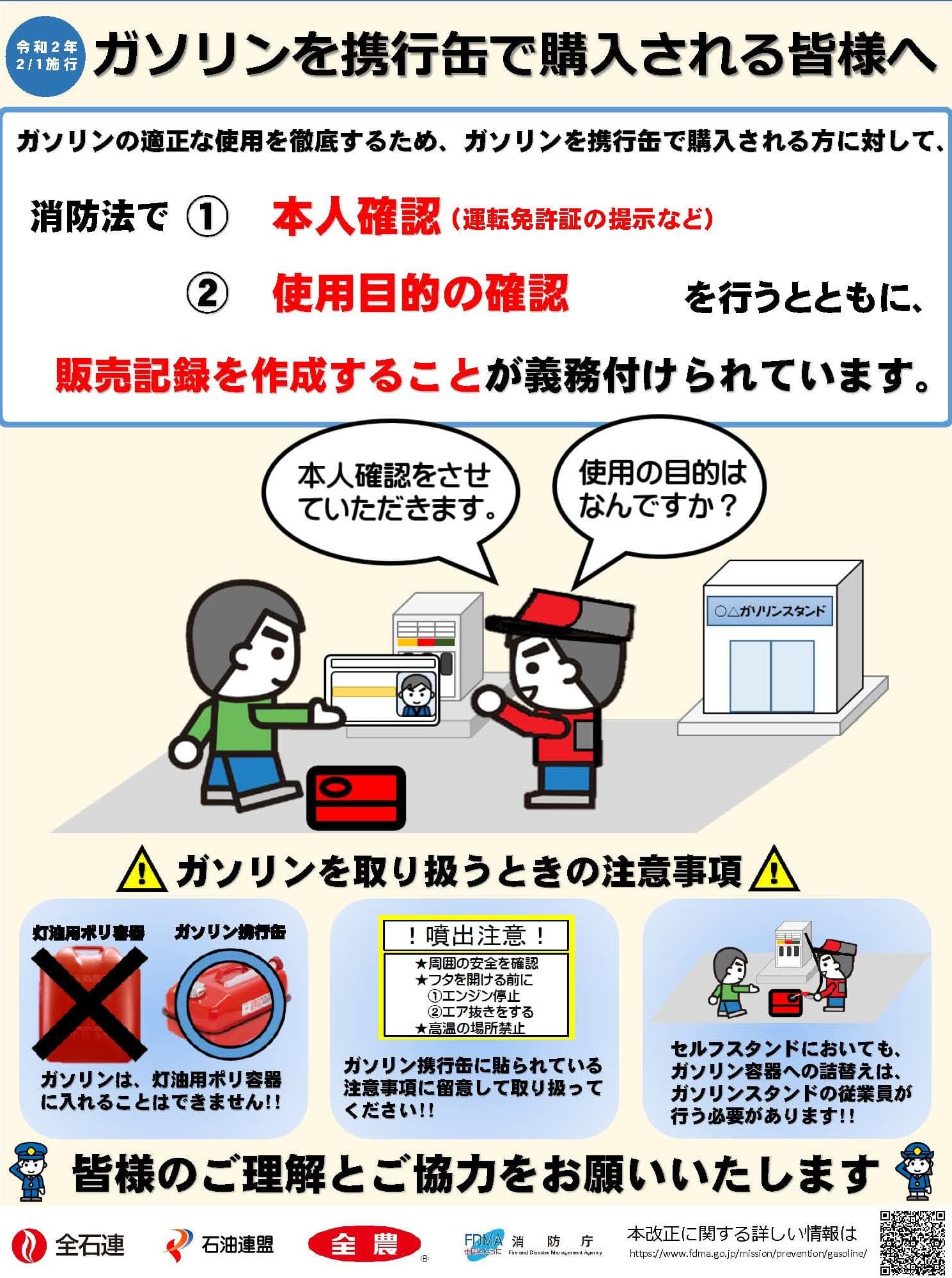 2019年7月の京都アニメーション放火事件を受け、この度ガソリンスタンドは携行缶等容器によるガソリン購入者への身分証の確認、使用目的の確認、販売記録の作成を義務付けられました。合わせて、本人確認等を拒否する等の顧客の警察庁への通報も要請されています。